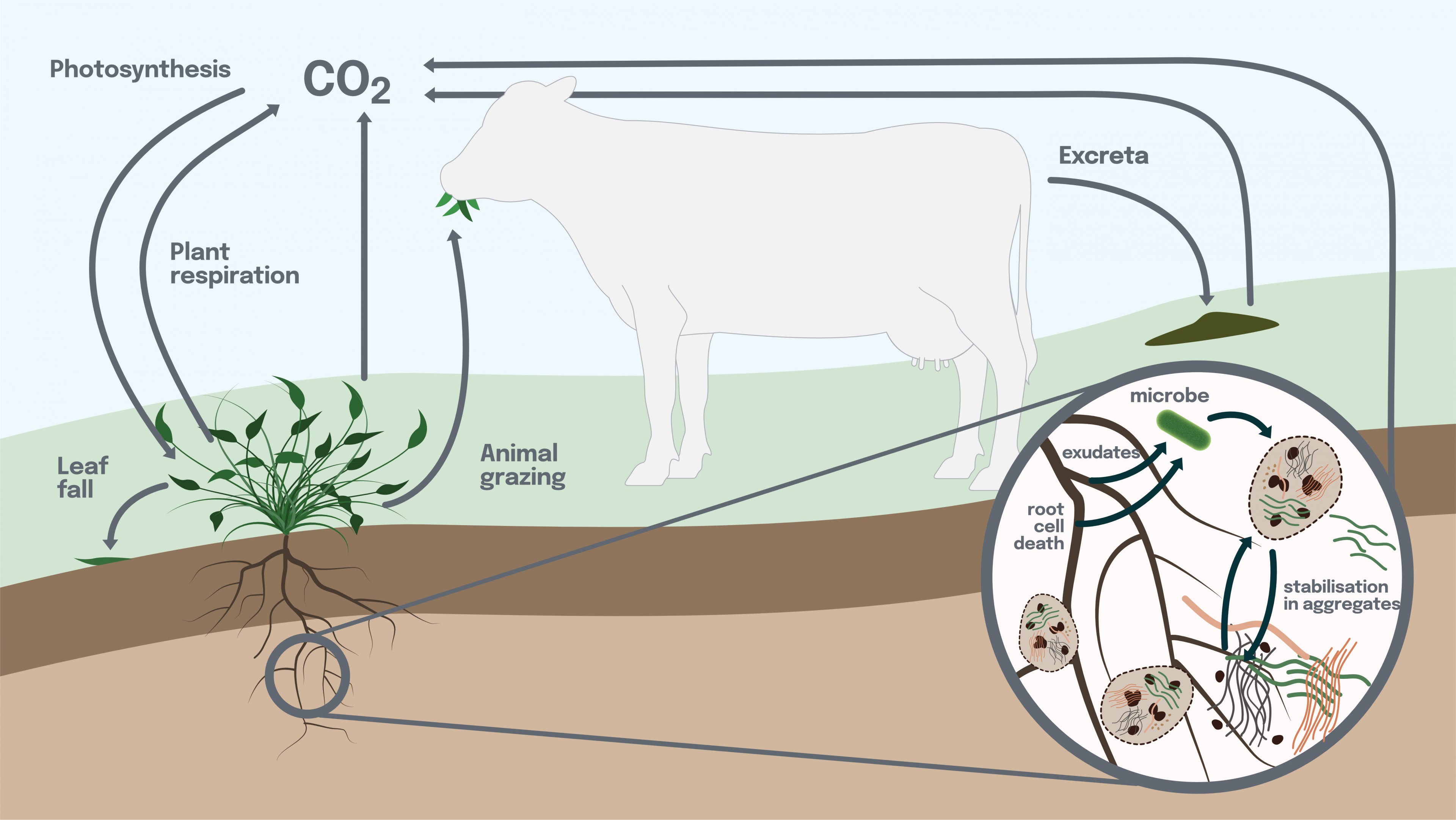 As shown in the diagram, microbes feed on all these carbon sources. When the microbes respire, most of the carbon is released back into the atmosphere as carbon dioxide. However, some of it bonds to the surfaces of silt and clay minerals and may be held in soil aggregates (clumps of soil particles). In this state, the carbon in soil organic matter is physically protected and less accessible to microbes (it is ‘stabilised’) and can remain locked away for tens to hundreds of years.